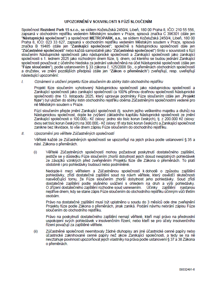 Společnost Rezident Park 15 s.r.o., IČO: 21055556, je ve smyslu § 79 zákona č. 90/2012 Sb., o obchodních společnostech a družstvech (zákon o obchodních korporacích), v platném a účinném znění („zákon o obchodních korporacích“), začleněna do koncernu Skupina Metrostav a podrobena jednotnému řízení ze strany řídící osoby, kterou je společnost Metrostav a.s., IČO: 000 14 915. Tato koncernová deklarace je uveřejněna v souladu s ustanovením § 79 odst. 3 zákona o obchodních korporacích.